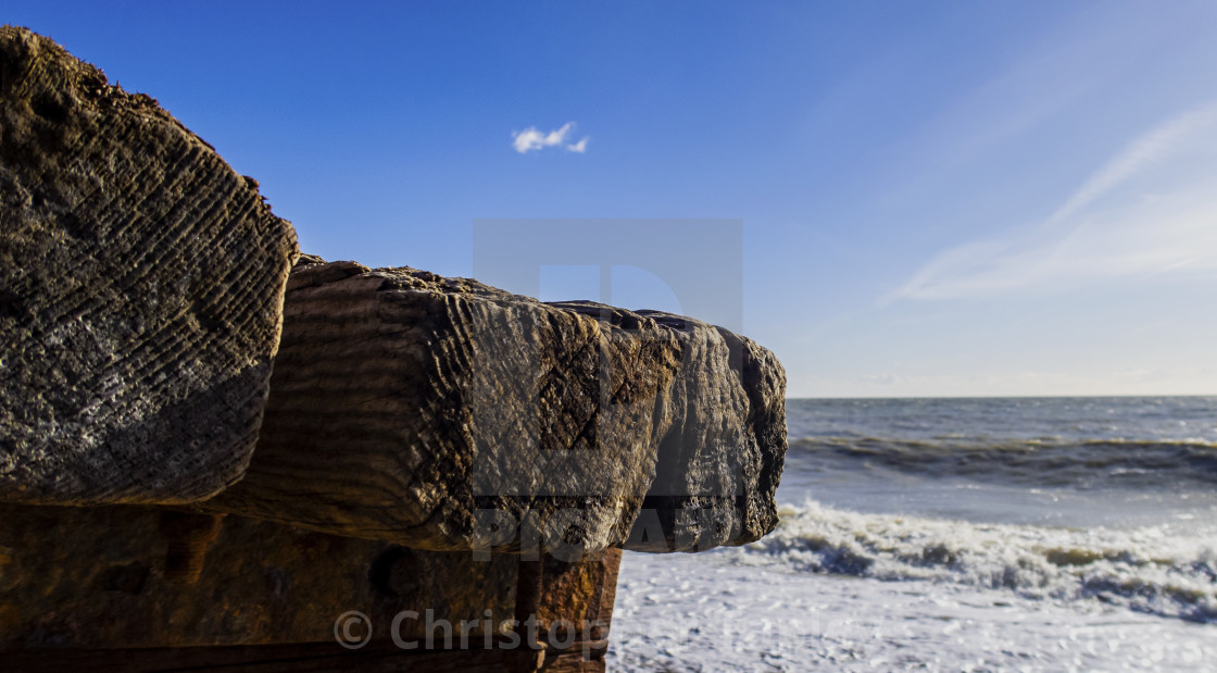 Old disused wooden jetty in Hythe, Southeast England, UK. Rich texture of the old wood is contrasted by the smooth background of the sea.